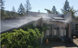 An automated wildfire protection system deploys sprinklers to dampen the roof and the surrounding 30 feet of property, along with a fine water mist to protect the sides of the home.