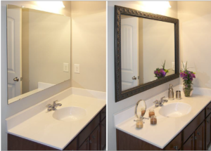 Best Bathroom Product: Easy Frame by Precision Works. This product is perfect for the do it yourself-er or the ecologically minded who wants to upgrade the look of a plain mirror with a decorative frame. They have patented a sticky backing great for use in the bathroom. Check out the before and after!