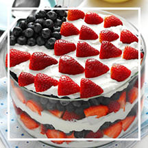 - Add the final layer of whipped cream and pattern the berries as shown in the photo to depict the flag (a wedge of blueberries for the star section, and stripes of strawberries).