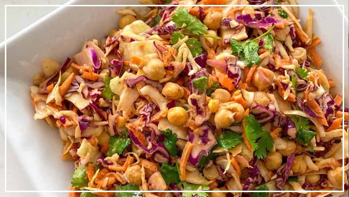 Coleslaw is easy to make ahead, and this peanut sauce makes it extraordinary. No added oil or sugar, this vibrant, protein packed dish served on a bed of lettuce can make it a main dish!