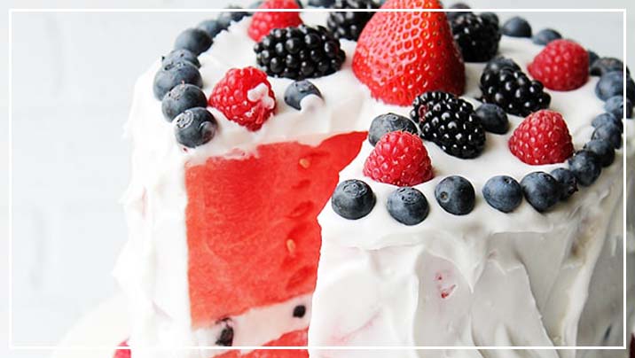 3. Spread about ½ cup of the frosting on the bottom cake layer. Cover with a layer of blueberries and spread about a ½ cup of frosting to cover them and add the top watermelon layer.